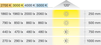 La longitud máxima de la tira (visual) es la longitud hasta una caída del flujo luminoso no perceptible de un máximo del 30 % en la longitud de un corte de tira. Tenga en cuenta: la sección de tira que sigue directamente con la nueva alimentación es perceptiblemente más brillante.